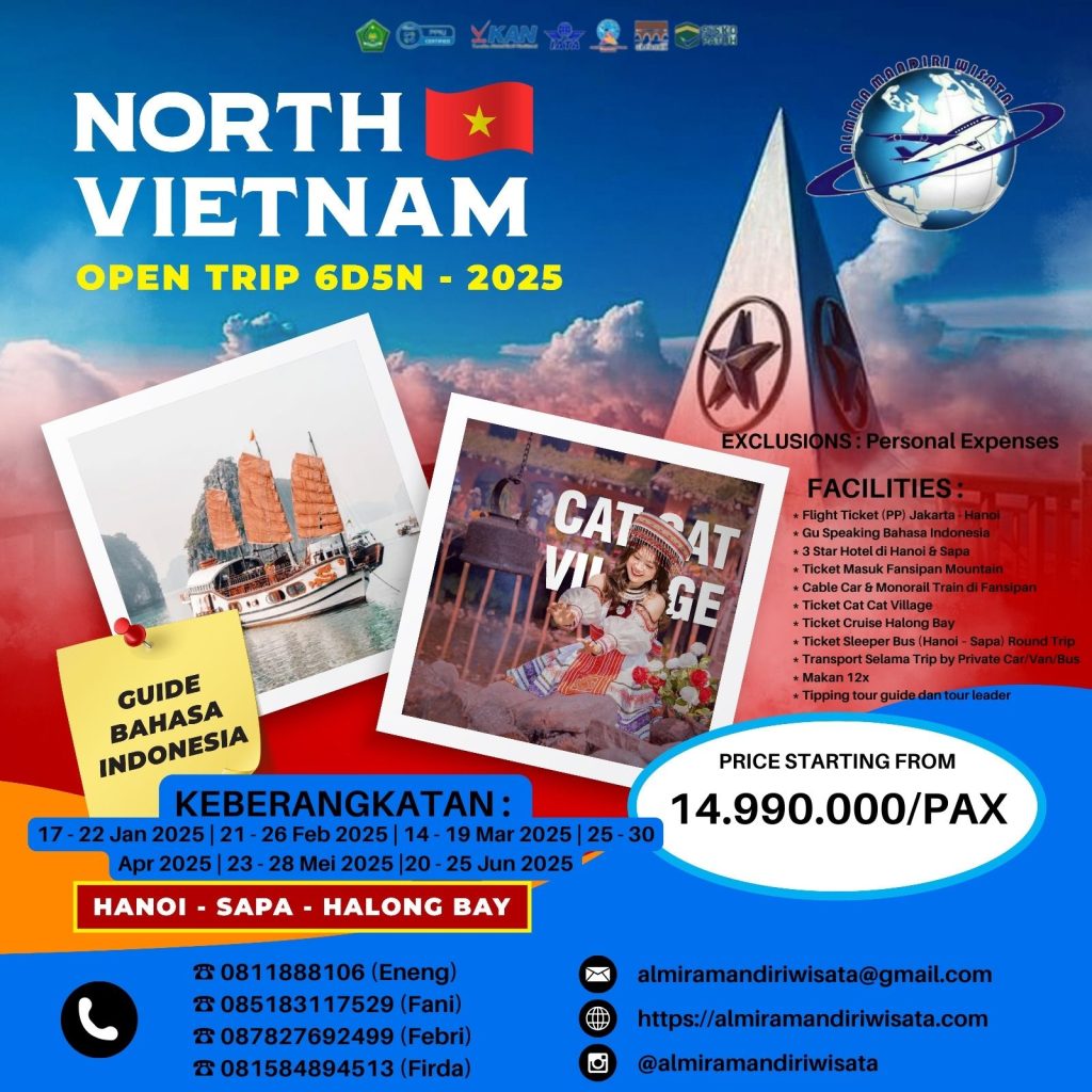Yuk joint untuk segera ikutan open trip vietnam 6D5N dimana kita akan explore spot-spot menarik di kota Hanoi – Sapa – dan Halong Bay, seperti: Cat Cat Village, Fansipan Mountain, Train Street, Hopping Island dengan Cruise, dan lain sebagainya.